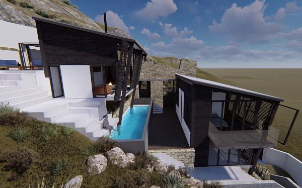 The complexities of positioning this house on a steel slope make the 180 degree view of the mountain and coast all worth it.